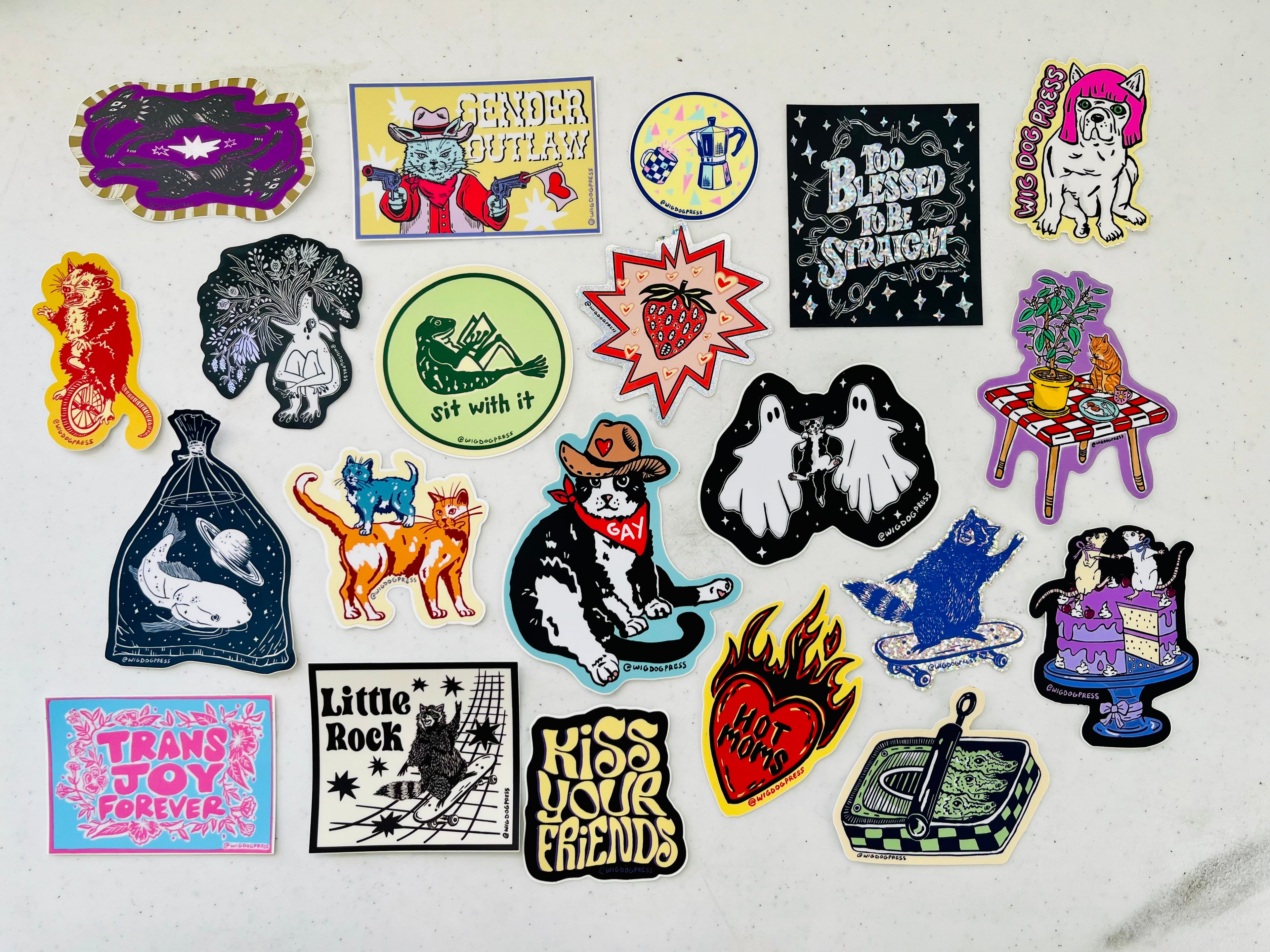 A team of queer friends creating screen prints on repurposed fabrics, carved linoleum block prints, hand sewn patchwork wall art, & colorful high quality stickers.